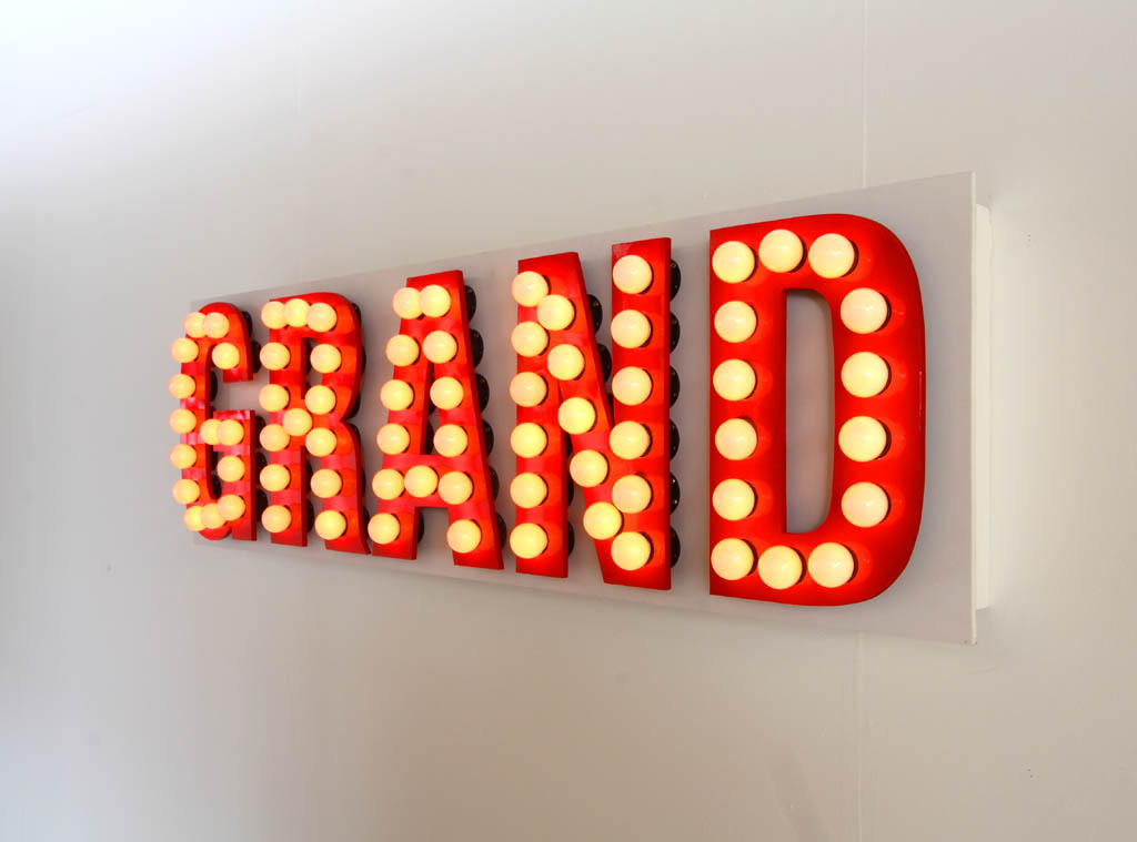 GRAND July 22, 2012 Return to: Light Comes ThroughFull resolution (1024 × 759) Image navigation Next Image GRAND. Mixed Media sign PVC, bulbs, copper wire, mdf 158x46x11cm Like Loading...