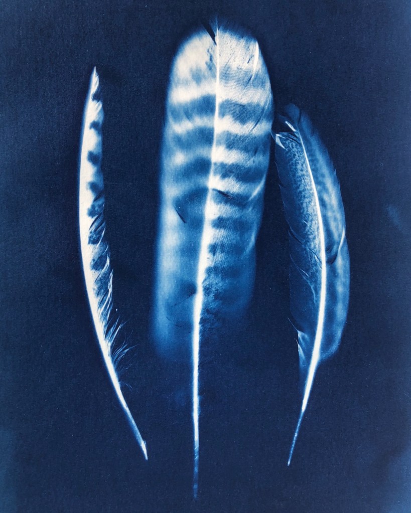 My Cyanotype prints (example below of cyanotype of pheasant feathers) are available on my online shop